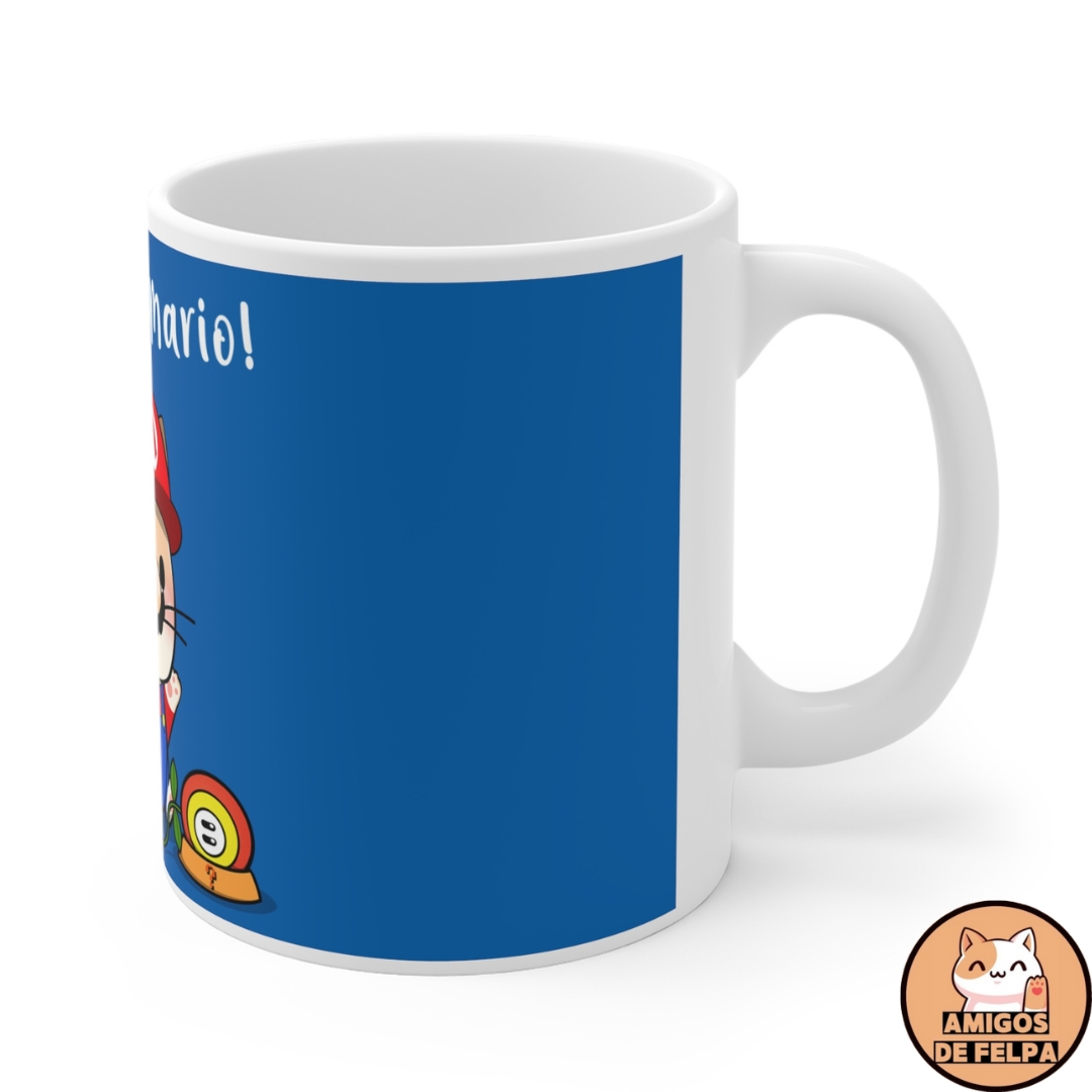 Taza «It’s Meow Mario». Fabricada en cerámica, la taza de 330 cc es perfecta para café, té o cualquier bebida mientras te acompaña un adorable gato vestido como el icónico Mario de Super Mario.